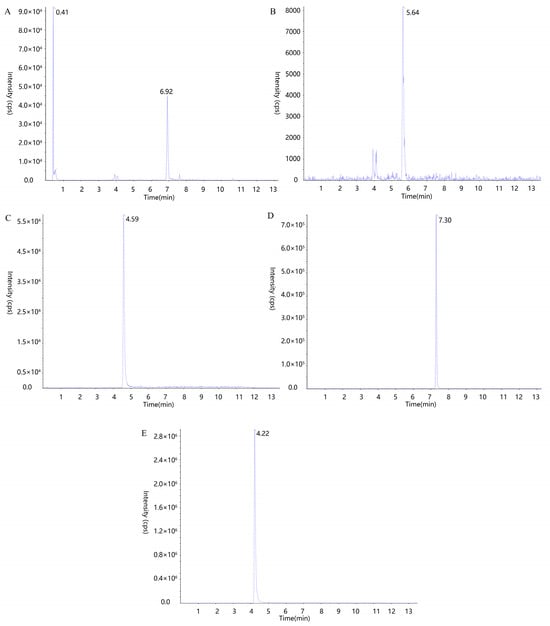 UPLC-MS/MS chromatograms of tetrahydropalmatine (A) 6.92 min and corydaline (A) 0.41 min, byakangelicin (B) 5.64 min, α-allocryptopine (C) 4.59 min, protopin (E) 4.22 min, and IS (D) 7.30 min of YZTs in plasma.