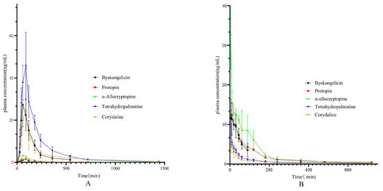 The mean plasma concentrations versus time profiles of protopin, α-allocryptopine, byakangelicin, tetrahydropalmatine, corydaline after oral administration (A) and intravenous administration (B) of single compound in beagle dogs (n = 6).