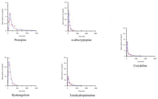 The UPLC-MS/MS chromatograms of five Q-markers, i.e., tetrahydropalmatine, corydaline, protopin, α-allocryptopine, and byakangelicin, in the plasma are shown in Figure 2. The standard curves of each component, obtained by measuring the peak areas of the standard samples at different concentrations (Table S1), indicate good correlations in the range and high sensitivity of the analytical method. The recoveries of the five components ranged from 85.39% to 110.92%, and the precision ranged from 1.27% to 11.44%, with detailed results in Tables S2 and S3. The stability results in Table S4 show that the components could keep stable for 24 h at 20 °C, 6 h in autosampler for liquid chromatography (6 °C) and freeze–thaw thrice.