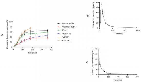 The dissolution of five Q-markers in YZTs was evaluated using the paddle method in accordance with the Chinese Pharmacopoeia. A popular brand of YZTs was chosen for dissolution experiment in six different media, including 0.1 M of HCl (pH = 1.2), acetate buffer (pH = 4.5), phosphate buffer (pH = 6.8), water (pH = 6.9), fasting simulated gastric fluid (FaSSGF), and fasting simulated intestinal fluid (FaSSIF-V2). The FaSSGF and FaSSIF-V2 were prepared as shown in Tables S5 and S6. The dissolution tests were conducted at a temperature of 37 ± 0.5 °C and a paddle speed of 75 rpm. Add 6 tablets to each dissolving cup, accompanied by 900 mL of dissolving solution, in 6 parallel aliquots, and samples of 3 mL were collected at 15, 30, 45, 60, 90, 120, 180, 240, and 360 min, respectively. Taking into account the gastric emptying time, the end time of dissolution measurement was 180 min when taking 0.1 M of HCl as dissolution medium. The dissolution medium was replenished after each sampling. The samples were filtered through 0.22 μm membrane and analyzed using the HPLC method described in Section 3.2. The chromatographic results were processed to calculate the concentration of each component at different time points, and the dissolution results were calculated using Equation (3) as follows: