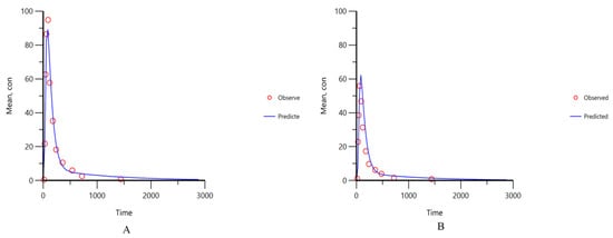In order to further apply the identified in vivo correlated dissolution conditions to different batches of YZTs, another brand of YZTs was selected for external validation of the dissolution conditions and IVIVC model results. The dissolution data of different brands in the identified media were input into the established IVIVC model to obtain the predicted blood concentration–time curve and to compare the PE% between the predicted value and the actual value.