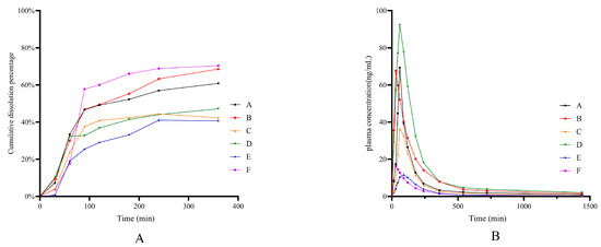 Five batches of YZTs named A, B, C, D, E, and F (A and B are the same brand but different lots, C, D, E, and F are different brands) were quantitatively analyzed, and the dissolution tests were carried out. Based on the dissolution curve, the pharmacokinetic curves of five batches of YZTs were predicted. The dissolution results and predicted concentration–time curves are shown in Figure 7. The AUC0-∞ and Cmax of each component in each YZT are calculated in Table 12. It can be found that both in vitro dissolution profiles and predicted in vivo pharmacokinetic profiles of YZTs made from different companies are quite different. For the same brand made by the same company, the error between batches was the smallest. However, more obvious pharmacokinetic errors between different brands from different companies were observed. The differences may be due to differences in herb quality, tablet formulation, and preparation process, which have been ignored for a long time. The identified in vitro dissolution conditions can serve as an effective tool for comparing and evaluating the inner quality of different YZTs.