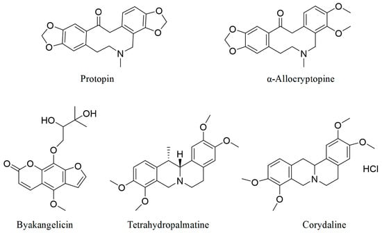 The chemical structures of protopin, α-allocryptopine, byakangelicin, tetrahydropalmatine, and corydaline.