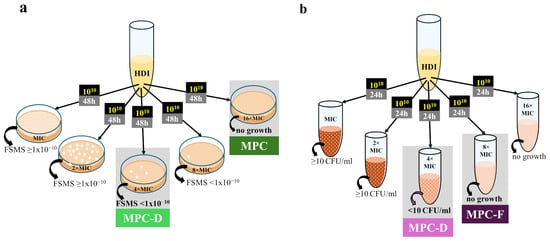 General procedures for the determination of in vitro parameters related to single-step resistant mutants: (a) Agar dilution method; (b) Broth dilution method. HDI, high-density inoculum; FSMS, frequency of spontaneous mutant selection; MPC, mutant prevention concentration; MPC-D, dominant mutant prevention concentration; MPC-F, inferior-mutant prevention concentration.
