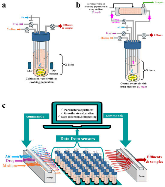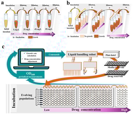 Assuming the stochastic nature of evolutionary changes while employing the serial transfer approach, many independent culture lines should be run concurrently for reliability. This increases the hands-on time required for daily manipulations, as well as the usage of tested compounds and other reagents [21]. Thus, although serial transfer can be performed manually with standard laboratory equipment such as flasks or tubes, various attempts have been made to miniaturize and automate these experiments, e.g., by conducting passages on microtiter [59,100,105,109,111] or deep-well plates [98,112], and employing either manual replicators [107] or robotic workstations consisting of a PC, a liquid-handling robot, a shaking incubator, a microtiter plate reader, and a microplate hotel (Figure 2c) [34,58,59,60,108,112,113]. In automated serial transfer setups, microtiter plates carrying cultures are incubated in a shaker, and the optical density (OD) is measured at fixed intervals [34,58,59,113]. From the OD measurements, the growth rate of each culture is calculated and compared with the growth rate determined in the absence of the antibiotic. Once it exceeds a fixed threshold (i.e., 30% of the no-antibiotic culture growth rate), cultures are automatically diluted with fresh media in the next wells, whereas the remaining portion of the culture is automatically mixed with glycerol and frozen. The antibiotic concentration can also be automatically adjusted at each dilution, e.g., if the growth rate exceeds 50–75% of the no-antibiotic culture growth rate, the concentration in the following passage is increased by a factor of 1.5–2; otherwise, it is maintained. This procedure keeps cells growing under sustained selective pressure at growth rates close to 50% of those of non-inhibited cells [34,58,59,113]. Such miniaturization and automation of serial transfer limit the risk of human error, reduce the hands-on time required, improve environmental control, and increase experimental throughput—even up to hundreds of populations can be conducted simultaneously [34,58,59,103,104,113]. Such properties are desirable during preclinical screening, although setting up and running a robotic workstation requires space and trained personnel. It also remains relatively expensive.