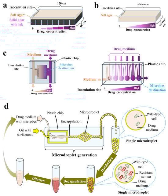 Setups for adaptive laboratory evolution (ALE) experiments in spatiotemporal microenvironments: (a) Microbial evolution and growth arena (MEGA) plate; (b) Soft agar gradient evolution (SAGE) plate; (c) Microfluidic chips; (d) Microdroplet-based system.