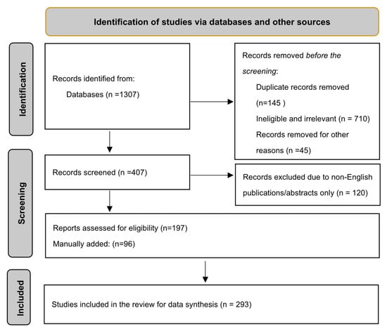 Inclusion criteria were English-language, full-text original research articles focused on NP penetration through the BCSFB, and with quantitative data from in vitro and in vivo models assessing BCSFB permeability. Exclusion criteria included non-English publications, conference abstracts, editorials, non-peer-reviewed articles, duplicates, and studies not focused on NP penetration or lacking quantitative data. Preference was given to studies with quantitative data on IT-NP penetration from the CSF into the brain parenchyma, aiming to compile a comprehensive body of literature on NP penetration across the BCSFB for treating neurological diseases. The review synthesizes topics such as the pharmacokinetics of NPs in CSF, the structure and function of the BCSFB, NPs (classifications and properties), penetration of IT-NPs into the brain parenchyma crossing BCSFB, NP uptake pathways, strategies to enhance NP drug delivery across the BCSFB, clinical applications, and future research directions. This approach aimed to compile a comprehensive and representative body of literature on NP penetration for treating neurological diseases and CNS infections. Figure 1 indicates how studies were identified using databases and other sources.
