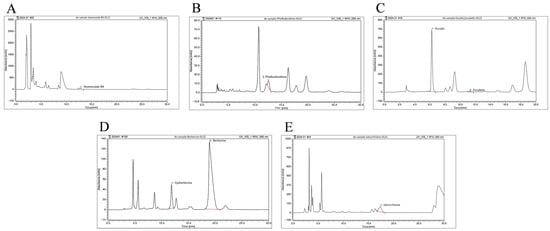 HPLC fingerprint of major components of BEPD. HPLC fingerprint of (A) anemoside B4, (B) phellodendrine, (C) esculin and esculetin, (D) epiberberine and berberine, and (E) jatrorrhizine of BEPD.