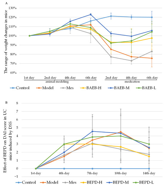 (A) Body weight changes. (B) Effect of BEPD on DAI score in UC mice induced by DSS.