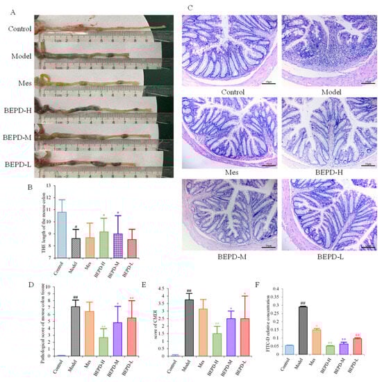 Anti-UC effects of BEPD against DSS-induced UC mice. (A,B) Representative pictures of colons from each group and the length of the mouse colon. (C) Representative HE staining of distal colon tissues (200× magnification). (D) Pathological score of mouse colon tissue. (E) Score of CMDI. (F) In the colon mucosal permeability experiment. (# p < 0.05 vs. control group, ## p < 0.01 vs. control group, * p < 0.05 vs. model group, ** p < 0.01 vs. model group. * p < 0.05 indicates statistically significant).