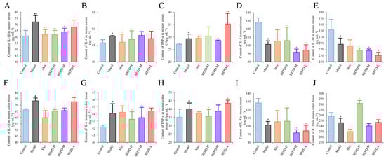 Effects of BEPD on cytokine production. (A–C) The levels of pro-inflammatory cytokines IL-1β, IL-6, and TNF-α in serum of UC mice. (D,E) The levels of anti-inflammatory cytokines IL-4 and IL-10 in serum of UC mice. (F–H) The levels of pro-inflammatory cytokines IL-1β, IL-6, and TNF-α in colon tissues of UC mice. (I,J) The levels of anti-inflammatory cytokines IL-4 and IL-10 in colon tissues of UC mice. (# p < 0.05 vs. control group, ## p < 0.01 vs. control group, * p < 0.05 vs. model group, ** p < 0.01 vs. model group. * p < 0.05 indicates statistically significant).