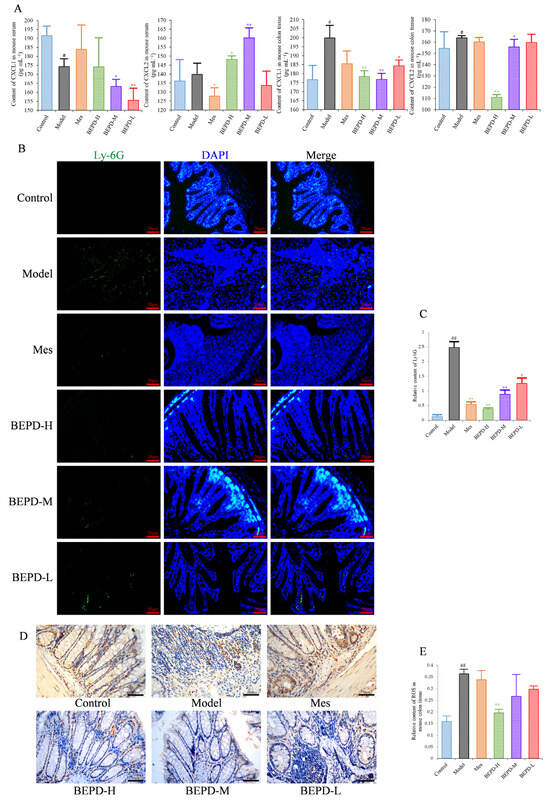 PMN activation was evaluated by staining for ROS. ROS cytoplasmic staining significantly increased in the colon tissues of model mice (p < 0.01), and decreased in all treated mice (p < 0.05), with BEPD-H treatment showing the most significant effect (p < 0.01), and BEPD-M and BEPD-L treatment showing similar effects to Mes (Figure 5D,E). These results indicate that the effects of BEPD on UC are related to the infiltration and activation of PMNs.