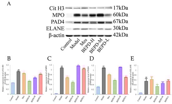 Effects of BEPD on the formation of NETs. (A–E) Western blot results of key proteins involved in NET formation, Cit H3, MPO, PAD4, and ELANE. (## p < 0.01 vs. control group, * p < 0.05 vs. model group, ** p < 0.01 vs. model group. * p < 0.05 indicates statistically significant).
