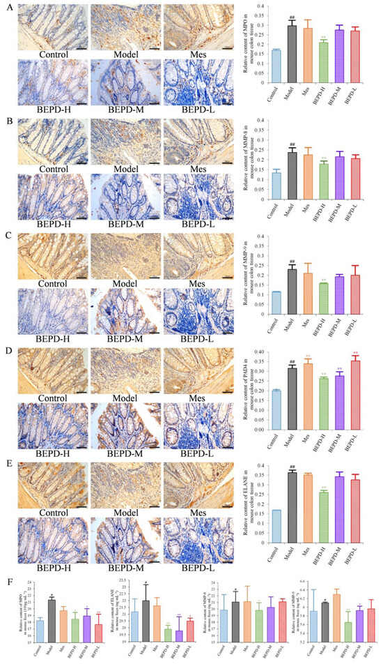 Effects of BEPD on the release of NETs. (A–E) IHC staining and semi-quantitative results of colon MPO, MMP-8, MMP-9, PAD4, and ELANE of mice in each group (400× magnification). (F) Relative content of MPO, MMP-8, MMP-9, and ELANE in mouse feces. (# p < 0.05 vs. control group, ## p < 0.01 vs. control group, * p < 0.05 vs. model group, ** p < 0.01 vs. model group. * p < 0.05 indicates statistically significant).