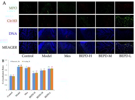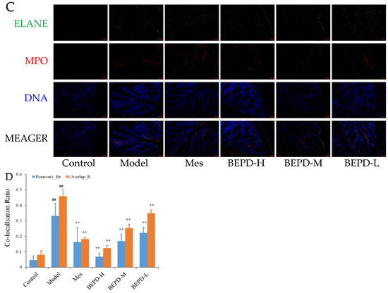Immunofluorescence co-localization analysis was used to demonstrate the formation of extracellular NET. By comparing Pearson’s and overlap, differences in NET formation in the colon tissues of mice were observed. MPO and Cit H3 co-located with DNA is a NET marker (Figure 8A); significantly increased NET formation was observed in the colon tissues of model mice compared with control mice (p < 0.01). Compared with model mice, Mes group mice showed a decrease in NET formation (p < 0.05), which was still significantly greater than that in control mice (p < 0.01), consistent with the decrease in PMN infiltration after treatment; BEPD group mice showed a dose-dependent decrease in NET formation (p < 0.01) (Figure 8B). As ELANE and MPO co-located with DNA (Figure 8C), significantly increased NET formation was observed in the colon tissues of model mice compared with control mice (p < 0.01). Compared with model mice, Mes group mice showed a decrease in NET formation (p < 0.01), which was still significantly greater than that in control mice (p < 0.01); BEPD group mice showed a dose-dependent decrease in NET formation (p < 0.01) (Figure 8D). Combined with the changes in PMN infiltration in the colonic mucosal tissue, this indicates that BEPD can inhibit extracellular NET formation.