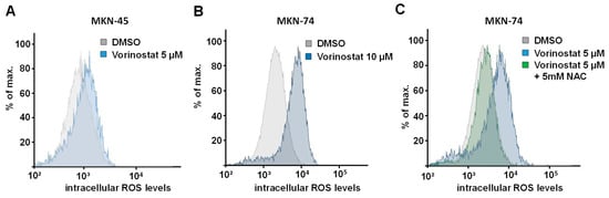 Effect of 48 h vorinostat treatment, alone or in combination with N-acetyl-L-cysteine (NAC), on oxidative stress in (A) MKN-45 and (B,C) MKN-74 cells. The formation of reactive oxidative species (ROS) was determined by the increase in fluorescence of the ROS-sensitive reagent CellRox Deep Red. A right shift of the fluorescence distribution indicates increased ROS formation. Representative FACS analyses of three independent experiments are shown, with each experiment being performed in duplicates.