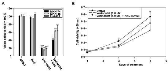 Vorinostat-dependent growth inhibition in MKN-74, MKN-45, and Hs746T cells. (A) Determination of viable cells after 48 h treatment with 5 µM vorinostat and/or 5 mM NAC as compared to vehicle (DMSO) control. (B) Effects of a lower vorinostat concentration (1 µM) on cell growth over 5 days and its modulation by NAC in MKN-45 cells. Of note, 25,000 cells in a 12-well format were used for the short-term incubation (A) and 750 cells in a 96-well format were used for the long-term incubation (B), which also affects the susceptibility of the cells to the treatment. Cell viability was determined using the formazan-based CCK8 assay. Each bar or point in the diagram represents the mean of at least three independent experiments + SEM. **, p < 0.01 and ***, p < 0.001.