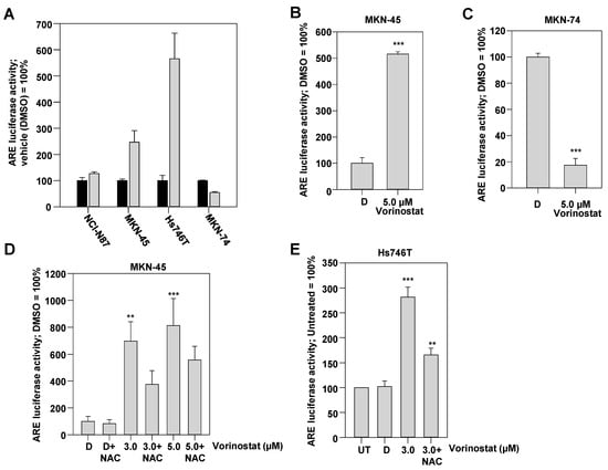 Determination of Nrf2 activity upon vorinostat treatment, alone or in combination with N-acetyl-L-cysteine (NAC), via luciferase reporter assay. (A) Treatment of a panel of cell lines with 3 µM vorinostat (gray bars) or vehicle (DMSO) (black bars) for 48 h led to vorinostat-induced increase of luciferase activity, indicating Nrf2 activation in most cell lines. Data represent the mean of luciferase measurements performed in duplicate. Additional experiments were performed in (B) MKN-45 and (C) MKN-74 cells treated with 5 µM vorinostat for 48 h or vehicle DMSO (“D”), showing opposite vorinostat effects on luciferase activity. Furthermore, the effect of NAC on vorinostat-mediated increase in luciferase activity was tested in (D) MKN-45 and (E) Hs746T cells. Graphs in (B–E) show mean values of at least three independent experiments + SEM. **, p < 0.01 and ***, p < 0.001.