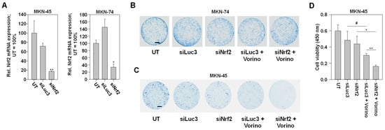 Considering the role of Nrf2 as a cytoprotective factor, we next investigated the influence of Nrf2 knockdown on the cytotoxicity of vorinostat in MKN-45 and MKN-74 cells. We selected these two cell lines due to the above-shown opposite vorinostat effects on Nrf2 (MKN-74: inhibition, MKN-45: activation). In colony formation assays, clonogenic cell survival of MKN-74 cells was unaffected by Nrf2 knockdown. Likewise, no effect on vorinostat cytotoxicity was observed (Figure 4B). In contrast, siNrf2 transfection of MKN-45 cells led to a reduction in colony formation and survival. Treatment with vorinostat yielded profound inhibition of clonogenic cell survival as well. Notably, however, the combination of both led to an almost complete abolishment of viable colonies (Figure 4C). A classical 2D cell viability assay showed comparable results. Again, the Nrf2 knockdown yielded a slight and the vorinostat treatment a somewhat more profound reduction in the number of viable cells. The most profound effects were again observed in the combined siNrf2 + vorinostat treatment (Figure 4D).