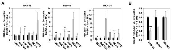 (A) RT-qPCR analysis of mRNA levels of Nrf2 target genes in MKN-45, Hs746T, and MKN-74 cells, treated with 3 µM vorinostat (grey) vs. DMSO (black) for 48 h. (B) Vorinostat effects on the mRNA levels of the Nrf2 regulator Keap1 in the three cell lines. Expression levels of the respective gene were normalized to beta-actin as the housekeeping gene, and the relative expression levels of vehicle (DMSO)-treated cells were set to 1. Mean values of three independent experiments + SEM are shown. *, p < 0.05; **, p < 0.01 and ***, p < 0.001.