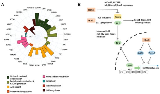 (A) Proteomics analyses of vorinostat vs. DMSO treated MKN-45 cells. Expression pattern alterations of various Nrf2 regulators such as Keap1, p21 (CDKN1A), p62 (SQSTM1), and DPP3, as well as of Nrf2 target genes, are shown. Lower panel: group association of altered genes to different biochemical/cellular functions. (B) Schematic overview of the complex and multimodal pattern of HDACi effects on Nrf2 levels and activity.