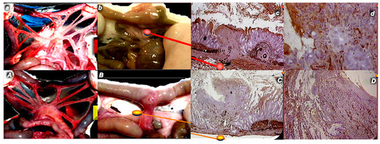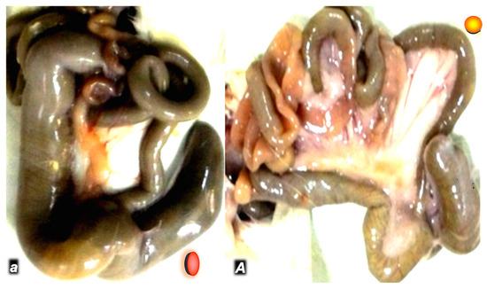 Day 7 post operation in rats that received cysteamine 400 mg/kg enema and colon–colon termino-terminal anastomosis (controls small italic letters, red circle; BPC 157 capital italic letters, yellow circle) (a,A). Subileus/ileus in controls (a), and intestine presentation close to normal in BPC 157 rats (10 µg/kg/day in drinking water) (A).
