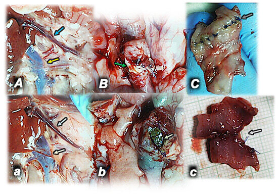 Rats with occlusion of the inferior mesenteric artery and colon–colon anastomosis (A,a,B,b,C,c) in control rats (lower, light color arrows) (small italic letters) and in rats that received BPC 157 in drinking water (upper) (capital italic letters). Superior mesenteric vein (blue arrows) and inferior caval vein (yellow arrows) congested (control, lower) (a) or close to the normal presentation (BPC 157, upper) day 3 post operation (left) (A). Anastomosis dehiscence open (control, lower) (b) or sealed with adhesion (BPC 157, upper) (B) (green arrows) (middle) day 5 post operation. Anastomosis presentation, poor (control, lower) (c) and fully healed (BPC 157, upper) (C) upon sacrifice day 7 post operation (gray arrows) (right).