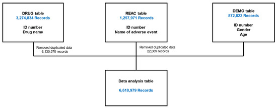 Flowchart for the construction of the data analysis tables. DRUG, drug information; REAC, adverse reaction information; DEMO, patient demographic information. Duplicate data in the DRUG tables were deleted. Three tables were combined using identification numbers.