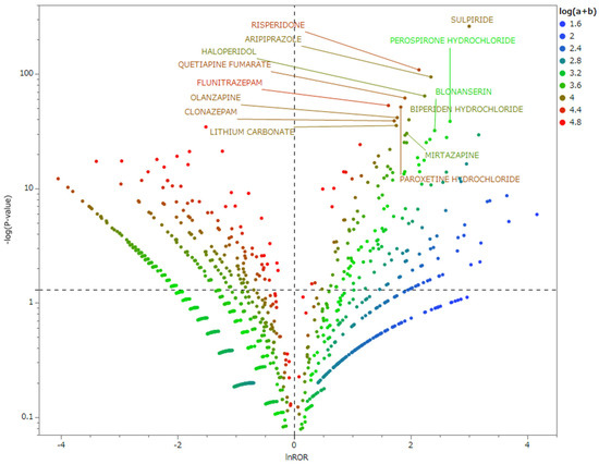 Drugs associated with Parkinson-like events. The X-axis shows the natural logarithm of the reported odds ratio (ln ROR). The Y-axis shows the reciprocal of the common logarithm for the p-value of Fisher’s exact test [−log(p-value)]. RORs were calculated using a crosstabulation table. The dotted line on the Y-axis represents a p-value of 0.05. The color of the plot represents the number of reported adverse events. Higher common logarithms of the total reported counts are shown in red and lower ones in blue. The color of the plot represents the number of reported adverse events. The common logarithm of the total number of reported times is shown in red to blue.