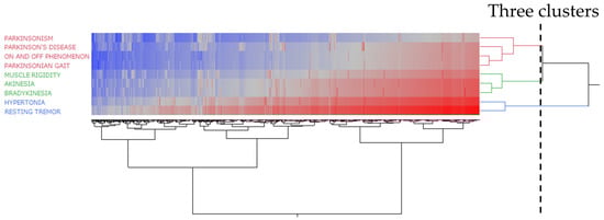 Figure 3 shows a dendrogram generated by hierarchical clustering resulting in three clusters. Based on the hierarchical cluster analysis of the side effects, the results were categorized into three groups: (1) Parkinsonism, Parkinson’s disease, the on–off phenomenon, and Parkinsonian gait; (2) muscle rigidity, akinesia, and bradykinesia; and (3) hypertonia and resting tremor.