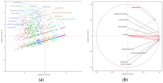 Figure 5 shows the results of the PCA. The contribution of the principal components was 92.3% for principal component 1 and 3.81% for principal component 2. We created a scattergram using the principal components 1 and 2 (Table S1). We then visualized the relationship between Parkinson-like events and each principal component representing each adverse event as a loading vector. In the loading plot, each adverse event was concentrated toward the right side and distributed very closely. Only Parkinsonism was slightly separated and positioned above the other groups. Meanwhile, the score plot shows 14 drugs as high-risk drugs, characterized by having an ln (ROR) > 1.5 and a −log(p-value) > 30.