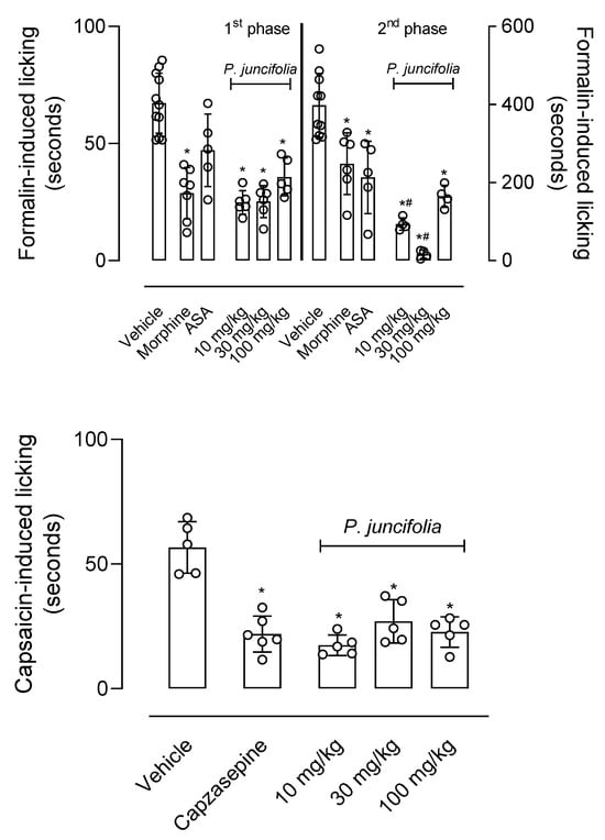 Decoction of P. juncifolia reduced nociception induced by formalin and capsaicin. Mice were pretreated with P. juncifolia (10, 30, or 100 mg/kg, oral), morphine (5 mg/kg, intraperitoneal), acetylsalicylic acid (200 mg/kg, oral), capsazepine (5 µg/kg, intraplantar) or vehicle 1 h after intraplantar injection of formalin (2.5%, 20 µL) or capsaicin (2 µg, 20 µL). The time the animal spent licking the injected paw was timed. Results are presented as media ± standard deviation (n = 6). Statistical analyses were performed with one ANOVA with Tukey post-test. * p < 0.05 when compared with vehicle-treated group and # p < 0.05 when compared with morphine- or ASA-treated group.