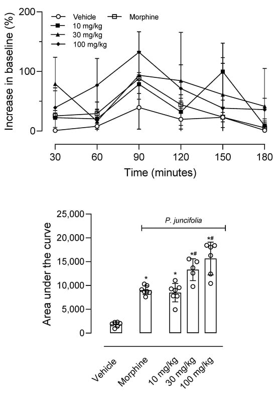 Decoction of P. juncifolia induces a central antinociceptive effect. Mice were pretreated with P. juncifolia (10, 30, or 100 mg/kg, oral), morphine (5 mg/kg, intraperitoneal), or vehicle and, every 30 min post-treatment, the response to the thermal injury was evaluated in the hot plate (55 ± 1 °C). Line graphs represent the time of response to the hot plate (shown as a percentage increase concerning the baseline) evaluated between 30 and 180 min after oral administration. The area under the curve was calculated based on data obtained from line graphs. The results are presented as mean ± SD (n = 8 per group) and statistical analyses were calculated by two-way ANOVA followed by Tukey’s post hoc test. * p < 0.05 when compared with the vehicle-treated group and # p < 0.05 when compared with the morphine-treated group.