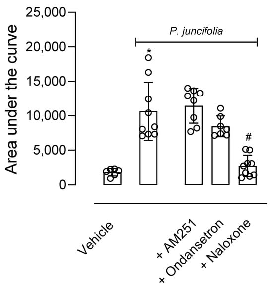 Effects of different antagonists on the antinociceptive activity of P. juncifolia evaluated in the hot plate model. Naloxone (1 mg/kg, i.p.), ondansetron (0.5 mg/kg, i.p.), or AM251 (1 mg/kg, i.p.) were administered 15 min before oral administration of P. juncifolia (100 mg/kg). Data are expressed as mean ± SD (n = 8). One-way ANOVA followed by Tukey’s post hoc test was used to calculate the statistical significance. * p < 0.05, when comparing P. juncifolia-treated mice to the vehicle-treated group, and # p < 0.05, when comparing antagonists pretreated mice with P. juncifolia-treated group.