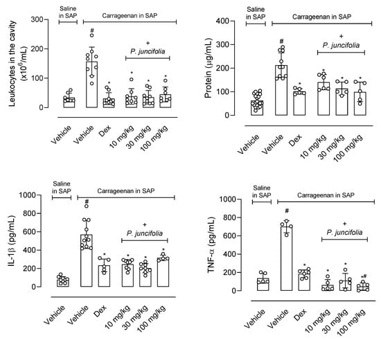 Effects of P. juncifolia extract in inflammation induced by carrageenan injection into the subcutaneous air pouch (SAP). Pretreatment of the animals with dexamethasone (1 mg/kg, i.p.) using P. juncifolia decoction (10, 30, or 100 mg/kg) or vehicle, 1 h before carrageenan injection into the SAP. The results are shown as the mean ± S.D. calculated with the Prism Software 8.02 (n = 6–8). One-way ANOVA was used followed by Tukey post hoc test to check the statistical significance. # indicates p < 0.05 when compared to the vehicle-treated group (animals treated with saline in the SAP) and * indicates p < 0.05 compared to the vehicle-treated group (animals that received carrageenan in the SAP).