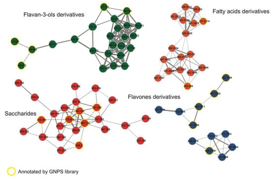 The forty-four compounds annotated by the GNPS library [12] and the analysis of the distribution of the secondary metabolites show a clear predominance of flavonoids followed by proanthocyanidins, chlorogenic acids, and their derivatives (Figure 5) (Table S1). The main secondary metabolites grouped in the molecular network are flavan-3-ols and flavones, in addition to the primary metabolites from the saccharides and fatty acids group (Figure 5). The classification of structures was according to the NP Classifier approach, associated with the GNPS. For the creation of the molecular network, the MS/MS data of each precursor ion were considered for the obtention of consensus spectra based on the spectral similarities and forming the clusters. In the case of the flavanol subclass, these are not grouped in the molecular network but present annotation of the precursor ions. Finally, all compounds have their molecular formula confirmed by HRMS (error less than 10 ppm) and, for each class, we manually inspected the gas phase chemistry involved in the fragmentation reactions (Figure 5, Figure 6 and Figure 7).
