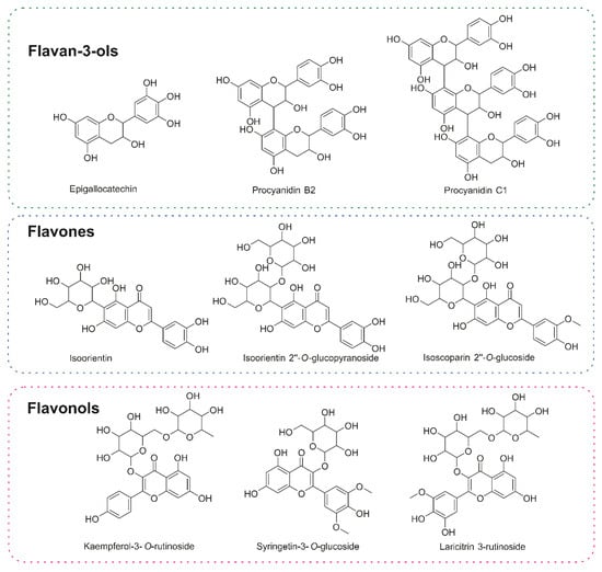 Chemical structures of flavonoid class annotated by GNPS library [12], which belong to the flavan-3-ol, flavones, and flavanol subclasses.