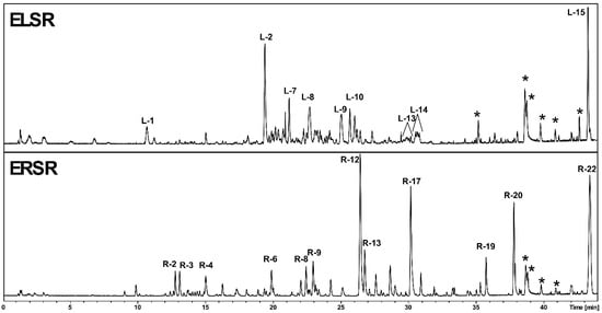 The ELSR and ERSR were analyzed in a liquid chromatograph (UFLC, Shimadz, Kyoto, Japan) coupled to a diode array detector (DAD, Shimadzu) and to an electrospray ionization time-of-flight mass spectrometer (ESI-QTOF-micrOTOF QII, Bruker Daltonics, Billerica, MA, USA); positive ionization mode, with detection between 120–1200 Da. The sample was injected into a column C-18 (Kinetex, 2.6 μm, Phenomenex, Torrance, CA, USA). The chromatographic and mass spectrometric parameters applied were the same as those used by Castro et al. [19]. We identified the metabolites in the ELSR and ERSR by analyzing their molecular mass, fragmentation patterns, and ultraviolet (UV) absorption spectra, comparing these characteristics with the existing literature data. Whenever possible, we confirmed the identities of these compounds through comparative analysis with authentic standards.
