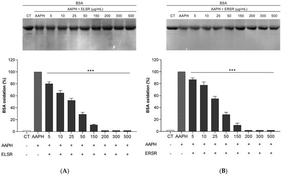 Effect of the protection promoted by the extracts against AAPH-induced oxidation of BSA. BSA was incubated with different concentrations of ELSR (A) and ERSR (B). Data present results from four independent experiments, *** p < 0.0001 compared to control BSA incubated with AAPH alone (AAPH). CT: BSA control.