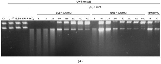 The protective effect of ELSR and ERSR against DNA fragmentation was evaluated using the method described by Kumar and Chattopadhyay [65] with modifications. A 4 μL aliquot of plasmid DNA (50 ng/μL) was incubated with 4 μL of ELSR or ERSR at different concentrations, diluted in PBS (5–500 μg/mL). Then, 4 μL of the oxidizing agent H2O2 at 30% was added to the respective treatments. The plasmid in the absence of UV light (CT), the plasmid in the presence of UV light (CTUV), the plasmid in the presence of the extracts plus UV light (ELSR or ERSR), and the control plasmid incubated only with hydrogen peroxide (H2O2) was used as the negative control. The effect of other reference antioxidants (rutin and catechin—150 μg/mL) on protecting DNA fragmentation was analyzed. The samples were incubated in a UVT-312 transilluminator at 302 nm at room temperature for 5 min. Then, the samples were applied to a 2% agarose gel containing ethidium bromide (10 mg/mL) and subjected to electrophoresis. Images of the gels were scanned using the Gel Doc™ EZ Imager photodocumentator (Bio-Rad Laboratories, Hercules, CA, USA) and analyzed using Image Lab™ software (version 6.0.1). The results of 3 gels were expressed as a percentage of DNA fragmentation.