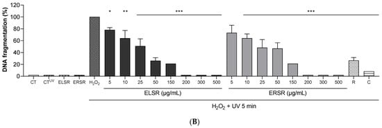 Effect of ELSR and ERSR protection against DNA fragmentation induced by H2O2 and UV radiation. Representative image of plasmid DNA bands (A). Percent fragmentation of plasmid DNA incubated with different concentrations (5–500 μg/mL) of ELSR and ERSR (B). Results expressed a percentage of DNA fragmentation. PC: Plasmid control; PCUV: Plasmid + UV control; ELSR: Plasmid + ELSR 500 μg/mL; ERSR: Plasmid + ERSR 500 μg/mL; H2O2: plasmid + H2O2 30%; R: rutin; C: catechin. Data present results from three independent experiments,* p < 0.05; ** p < 0.01, and *** p < 0.001 compared to control DNA incubated with H2O2 and subjected to UV.