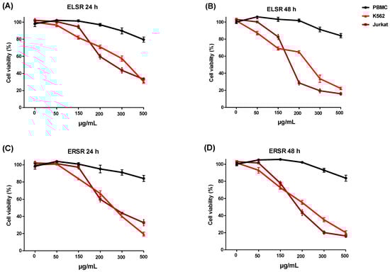 Cell viability of PBMC, K562, and Jurkat cell lines after 24 (A,C) and 48 h (B,D) of treatment with different concentrations of the ELSR and ERSR (0–500 μg/mL). Data were expressed as the means ± SEM of three independent experiments.