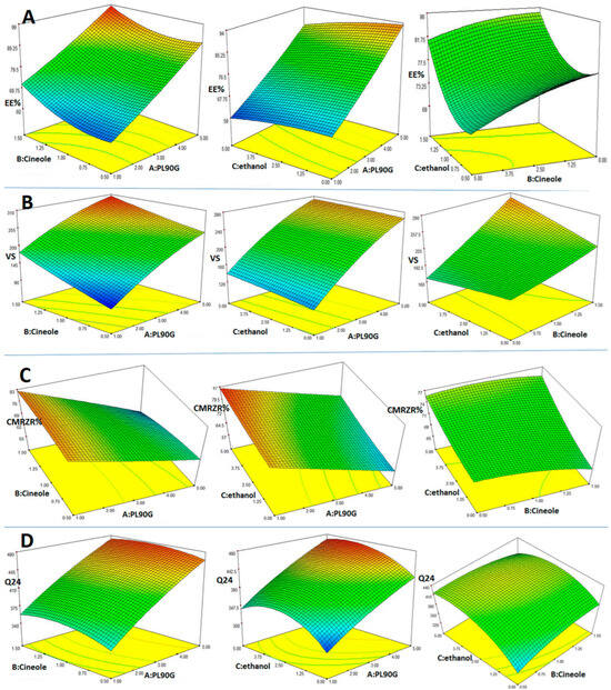 The 3D surface response diagrams showing the contribution of the three variables on (A) EE%, (B) vesicle size, (C) CMRZR%, and (D) Q24.