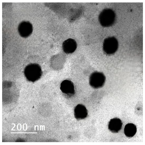 TEM analysis is a valuable method for conveying the findings of dynamic light scattering (DLS) in tandem with vesicle size as well as investigating the morphological characteristics of colloidal platforms. TEM analysis demonstrated the optimized MRZ-NVMs formulation as ebony specks, indicating vesicles with spherical shapes and sleek exteriors devoid of any conglomeration of MRZ particles, as seen in Figure 2. The image indicates the presence of vesicles at the same nanometer scale, suggesting a potential correlation with the VS as evaluated by the DLS approach. ZP indicates the stability of NVMs, as it shows the propensity of nano-paradigms to undergo agglomeration. The substantial magnitude of the negative results may be attributed to the involvement of ethanol and PL90G. The presence of ethanol modifies the overall surface charge, increasing vesicular charges’ stability via electrostatic repulsion, hence restricting their eventual aggregation [60]. In a similar manner, the phosphatidyl group of PL90G, which carries a negative charge, may be oriented towards the outer region, while the positively charged choline group could tilt towards the inner region. This arrangement would lead to a substantial magnitude of negative charges [61]. DSC and FT-IR results suggest that the components of the MRZ-NVMs optimized formulation are compatible, confirming no physical interactions were recorded; this is complementary to the physical stability study results.