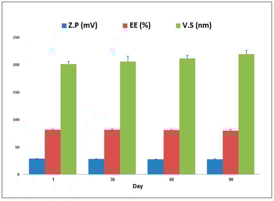 The optimized vesicles showed stable, spherical, and approximately monosized vesicles (Figure 2) with an average ZP value of −28.8 ± 0.22 mV (Supplementary Figure S3). The stability analysis demonstrated that there was no significant difference (p < 0.05) between the optimized MRZ-NVMs formulation after a storage period of 90 days and the fresh one in values of EE%, invasomal VS, or ZP (Figure 3). The boosted formulation exhibited no precipitation or layer differentiation indications, suggesting acceptable kinetic stability.