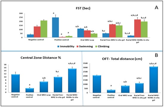 (A) FST behavioral analysis (immobility, swimming, and climbing) for MRZ oral suspension and the MRZ-NVM rectal pH-triggered gel preparation in comparison to normal control and positive depressed rats. (B) OFT behavioral analysis of the total distance (cm) and the central zone (%) traversed by MRZ oral suspension and the MRZ-NVM rectal pH-triggered gel preparation compared to negative and positive controls. a p < 0.05 relative to the negative control; b p < 0.05 relative to the positive control; c p < 0.05 relative to MRZ-susp (oral); d p < 0.05 relative to free mRZ- in situ rectal gel.