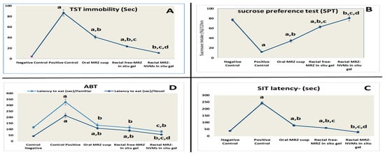 (A) Total time in seconds for immobility in TST for oral and rectal preparations compared with normal control and depressed rats. (B) Effect of stress of food deprivation in rats (Sucrose Preference Test) within 12 h for oral and rectal preparations and the negative and positive control groups. (C) Social interaction latency time in seconds for rats dosed with oral and rectal preparation compared to normal and depressed groups. (D) Latency time in seconds for rats to start eating in novel and familiar environments in Anxiety-Based Test (ABT) in oral and rectal groups and compared to negative control and positive groups. a p < 0.05 relative to the negative control; b p < 0.05 relative to the positive control; c p < 0.05 relative to MRZ-susp (oral); d p < 0.05 relative to free mRZ- in situ rectal gel.
