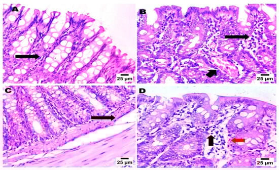 The impact of various treatments, orally administered MRZ (B), plain in situ rectal gel (C), MRZ-NVM in situ rectal gel (D), and compared to negative control (A), on the mucosal rectal epithelium histopathology. The rectal epithelium exhibted an intact epithelial lining (black arrow) and a submucosa with average blood vessel denisty with no congestion or inflamation (red arrow).
