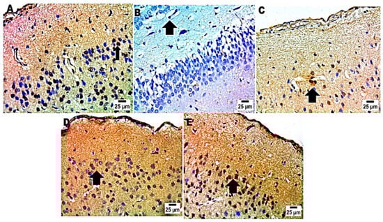 The impact of various interventions: negative control (A), positive control (B), MRZ–suspension (oral) (C), MRZ plain in situ rectal gel (D), and MRZ-NVM in situ rectal gel (rectal) (E) on the neurological activity and percentage of positive immune cells (black arrows) in the cerebral cortex of the brain.