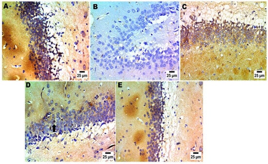 The impact of various interventions: negative control (A), positive control (B), MRZ–suspension (oral) (C), MRZ plain in situ rectal gel (D), and MRZ-NVM in situ rectal gel (rectal) (E) on the neurological activity and percentage of positive immune cells (black arrows) in the hippocampus of the brain after depression treatment.